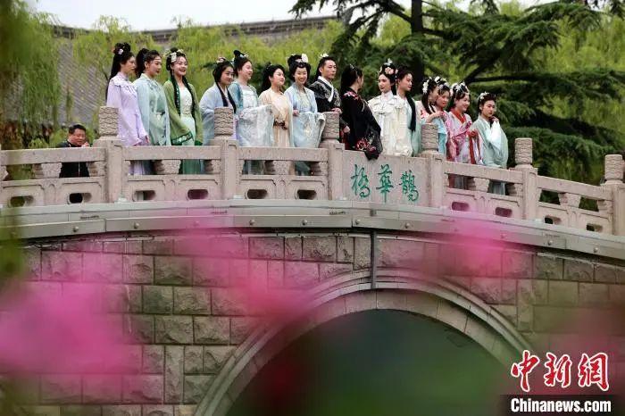 民众着华服在大明湖鹊华桥拍照。梁犇 摄