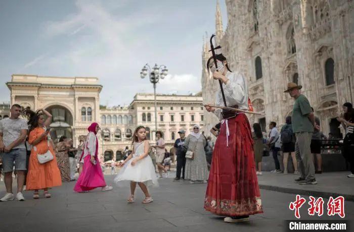 2023年8月,山东潍坊留学生郑晓慧身穿马面裙在意大利米兰街头演奏二胡。(郑晓慧供图)