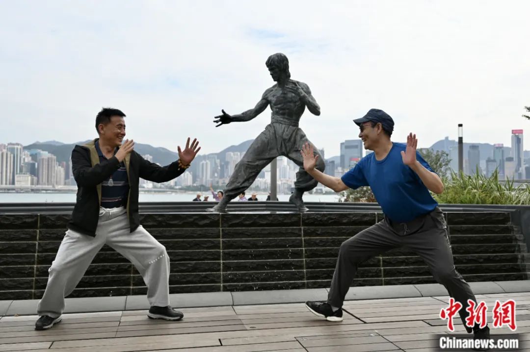 2023年11月,香港,游客摆出李小龙铜像的姿势合影。李志华 摄