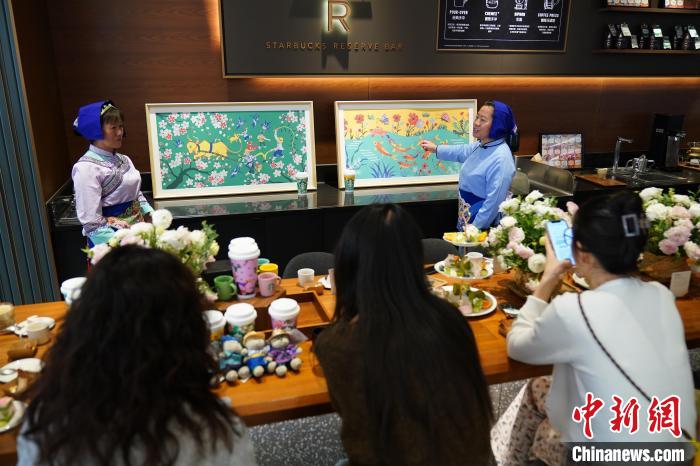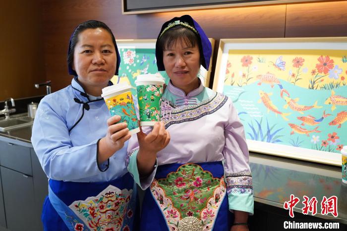 图为农民画家展示她们被印在星巴克咖啡纸杯上的画作。中新网记者 刘冉阳 摄