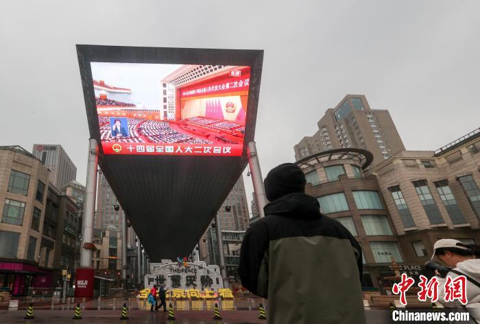 3月5日,十四届全国人大二次会议在北京人民大会堂开幕。图为北京一户外大屏播放开幕会。 中新社记者 贾天勇 摄