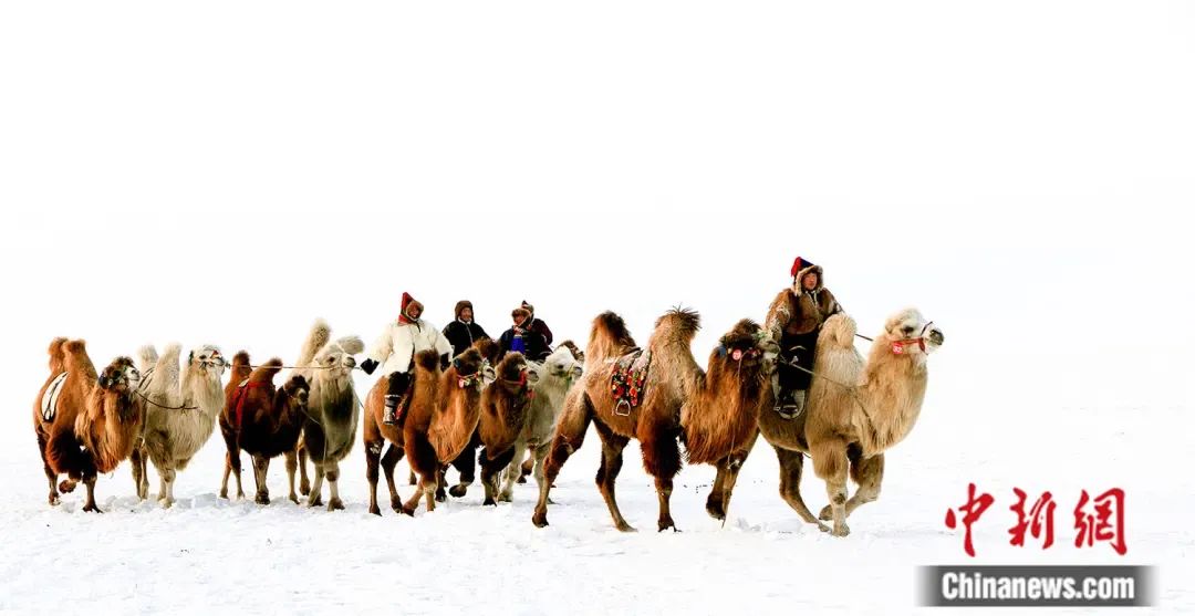 银装素裹中,牧民骑着骆驼赶往赛驼现场。 高洪斌 摄