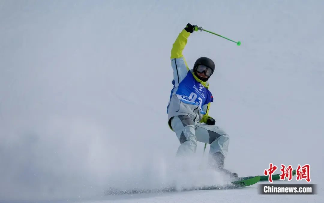 “十四冬”自由式滑雪公开组男子大跳台冠军杨昊,在扎兰屯金龙山滑雪场参加比赛。 牛天甲 摄