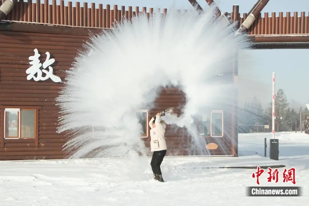游客在极寒天气中体验泼水成冰的快乐。 根河市委宣传部供图