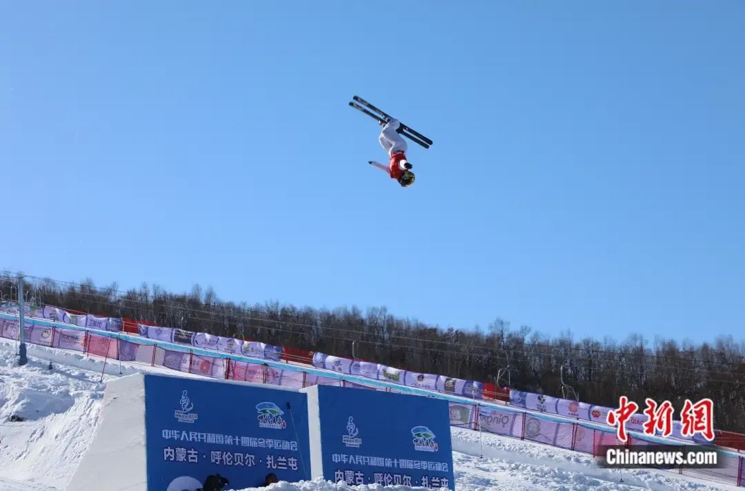 “十四冬 ”自由式滑雪空中技巧公开组女子个人比赛中,徐梦桃在空中翻飞。 韩冷 摄
