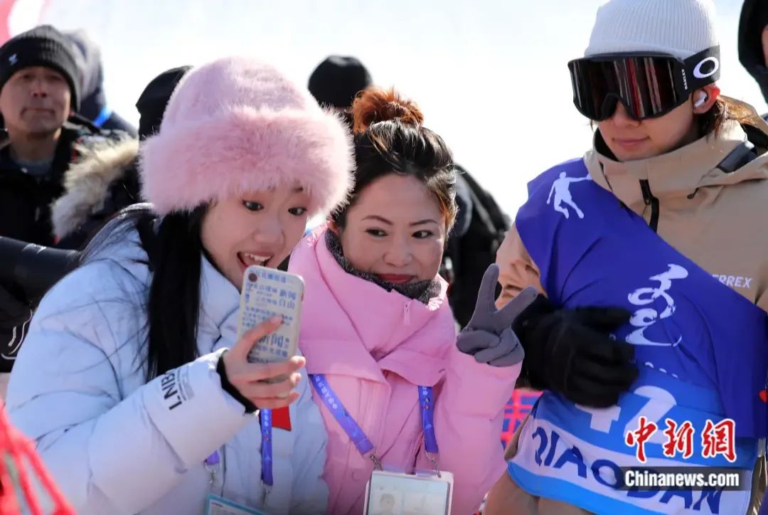 “十四冬”单板滑雪大跳台公开组男子决赛现场,观众找比完赛的苏翊鸣(右一)合影。 韩冷 摄