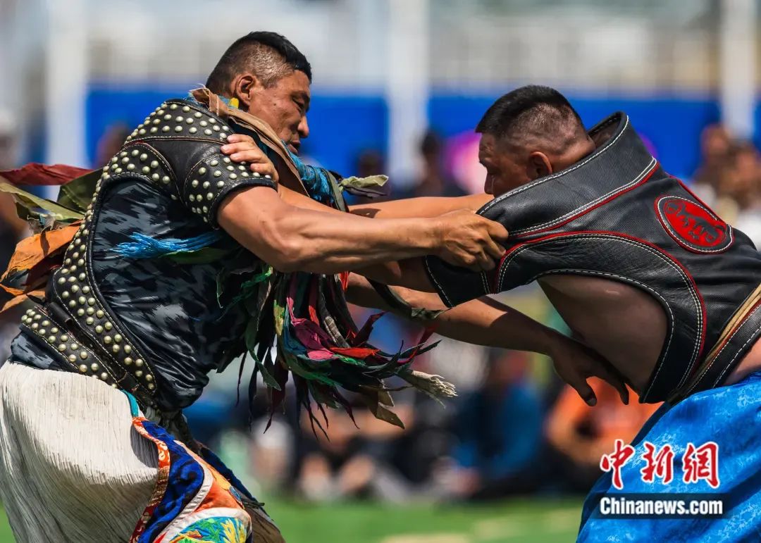 鄂温克草原上的蒙古族那达慕上演传统“男儿三艺”——搏克比赛。 呼木吉乐 摄