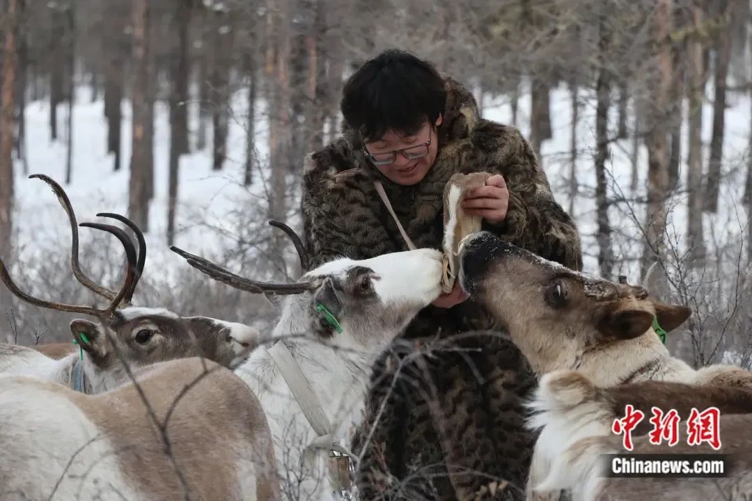 在中国最后一支使鹿部落里,驯鹿贪婪地吃着使鹿鄂温克人觉乐手里的豆饼。 王郑胤 摄