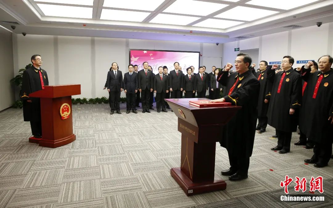 2019年1月1日,中国最高人民法院知识产权法庭在北京揭牌成立,最高法知识产权法庭全体法官进行宪法宣誓。李慧思 摄