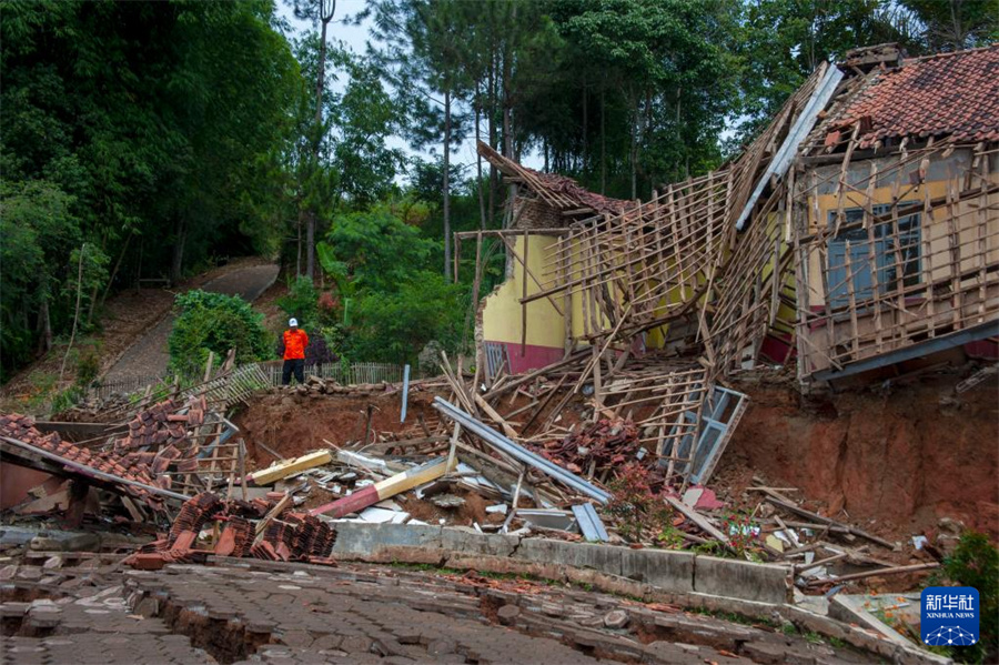 3月4日,一名男子在印度尼西亚西爪哇省的山体滑坡现场查看情况。新华社发(塞提安贾尔摄)