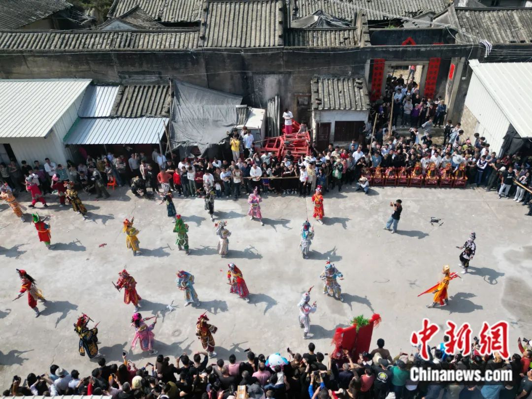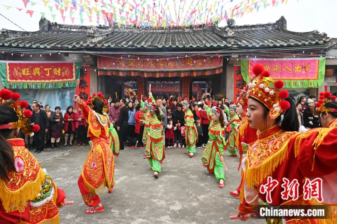 2024年2月20日,广东潮州溪美寨村举行传统游神民俗活动,巡游队伍的英歌舞表演吸引民众观看。陈楚红 摄