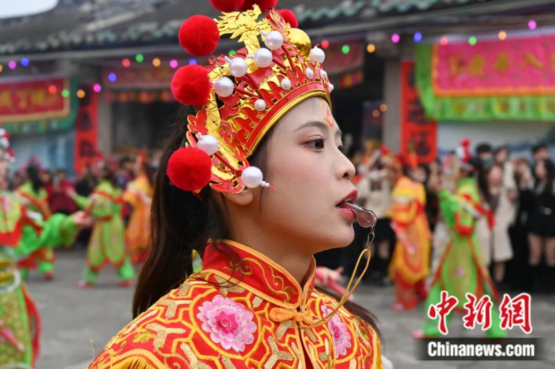 2023年2月9日,广东潮州,潮阳西门女子英歌队亮相仙都乡妈祖文化巡游活动。陈楚红 摄