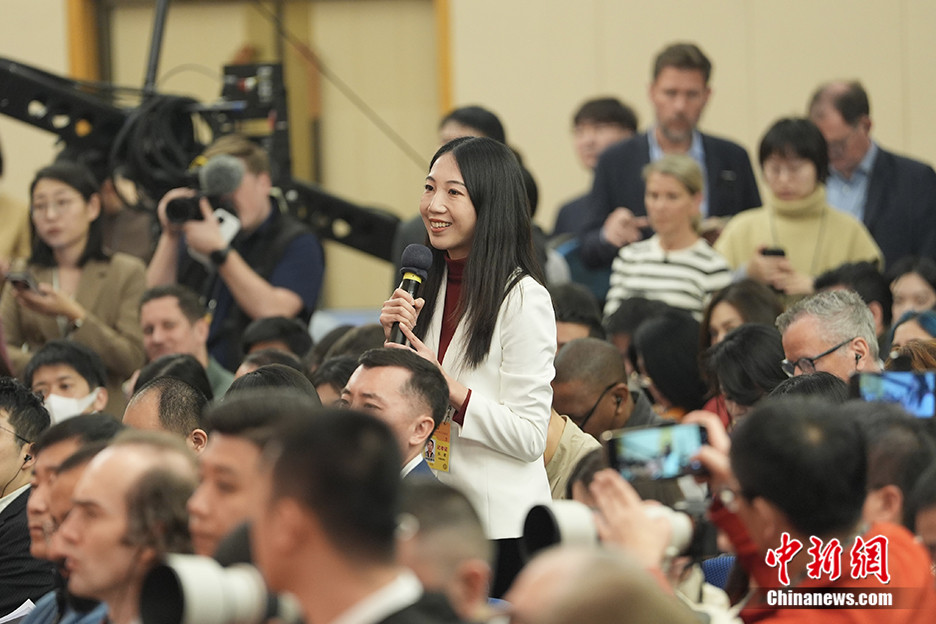 3月7日,十四届全国人大二次会议举行外交主题记者会,图为中新社记者提问。中新社记者 崔楠 摄