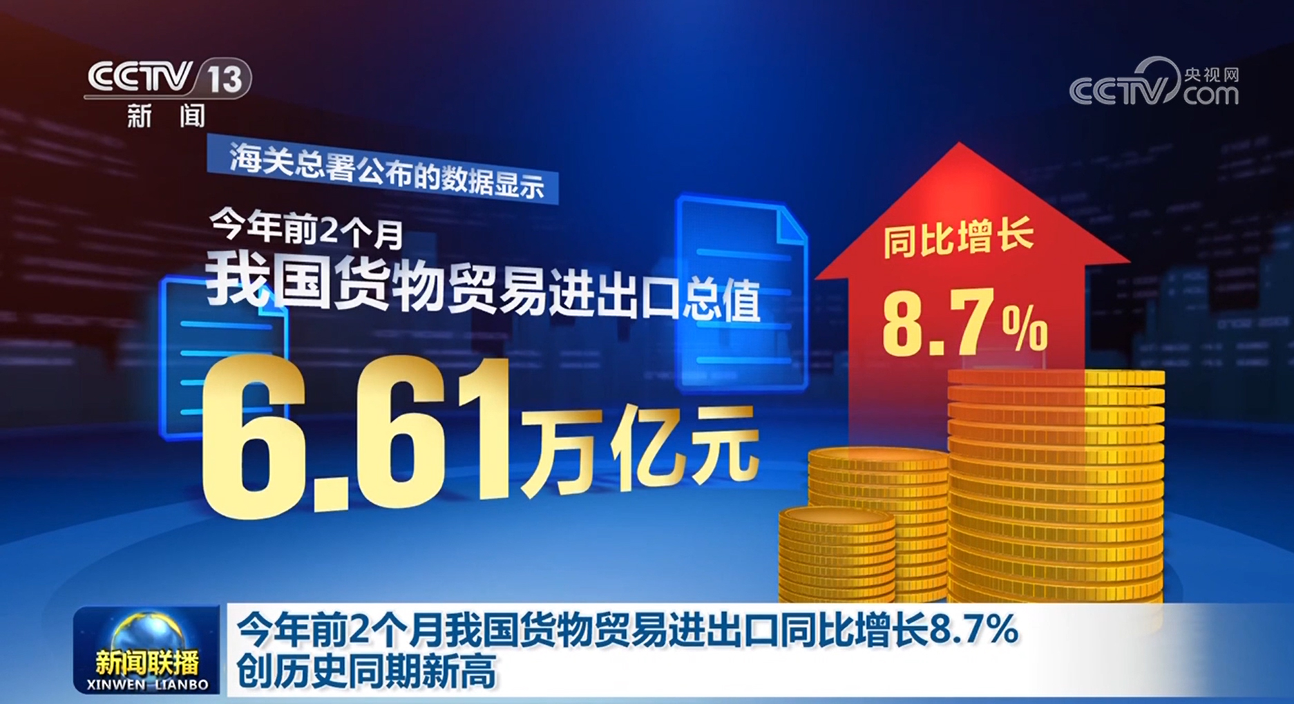 央视网消息(新闻联播):记者今天(3月7日)从海关总署获悉,今年前2个月,我国货物贸易进出口规模创历史同期新高,外贸实现良好开局。