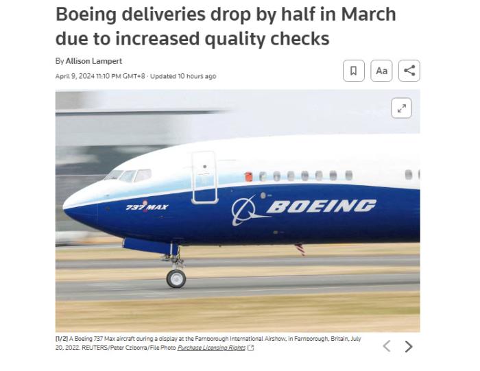 外媒:严格审查下 波音第一季度新机交付数不足百架