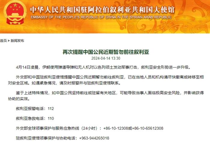 使馆消息称,4月14日凌晨,伊朗使用弹道导弹和无人机对以色列领土发动军事打击,叙利亚安全形势进一步升级。