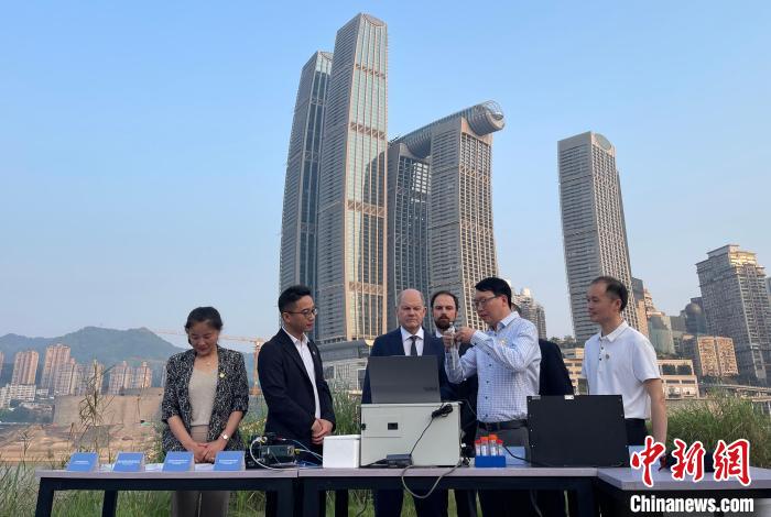 2019年,重庆大学智能生化传感与精密仪器团队和德国库特-施瓦伯测量与传感器科技研究所,共同开展生态环境保护领域的水环境污染物高效检测技术与装备的研究开发。在长江和嘉陵江交汇处的江岸边,该项目的重庆大学研究团队向朔尔茨介绍检测仪器如何进行水质检测与分析。朔尔茨将检测样品注入检测仪后,查看了检测结果。