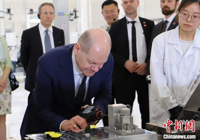 图为朔尔茨(左一)了解博世与中企合作的最新成果。中新社记者 贾楠 摄
