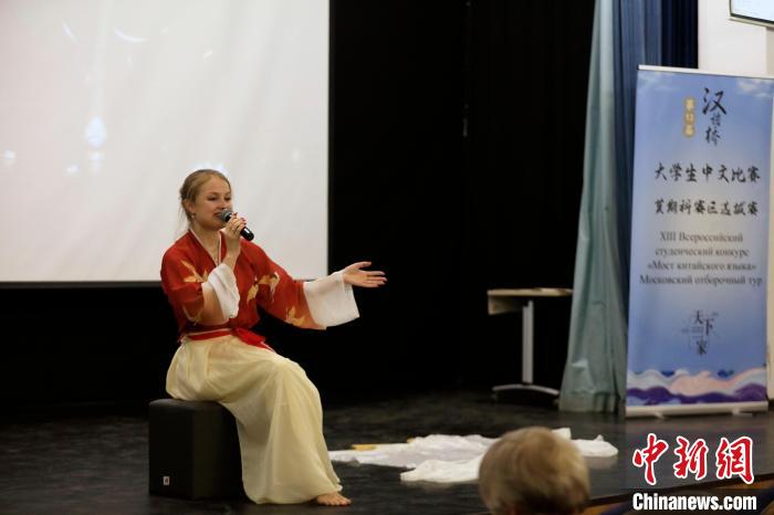 4月12日,第十三届全俄“汉语桥”大学生中文比赛莫斯科赛区选拔赛在莫斯科国立语言大学举行。图为参赛选手在“中华文化技能”比赛环节。(中新网记者 田冰 摄)