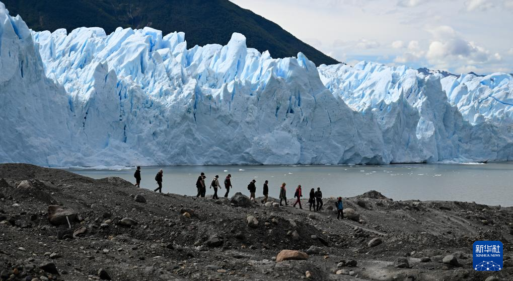 1月3日,游客在阿根廷圣克鲁斯省冰川国家公园内的莫雷诺冰川附近行走。