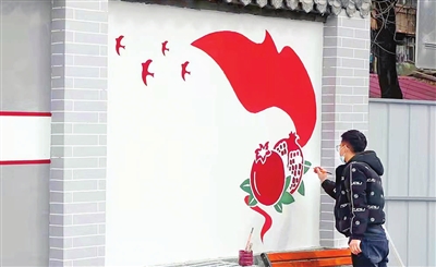 图为专业人员对墙体进行主题彩绘。朱明钥 李朋林 摄影报道
