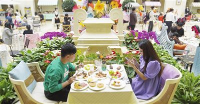 随着复工复产的脚步加快,天津市各大商圈在做好疫情防控的前提下,渐渐恢复了“烟火气”。图为人们在一家花园式餐厅中品尝精致美食。记者 孙立伟 摄