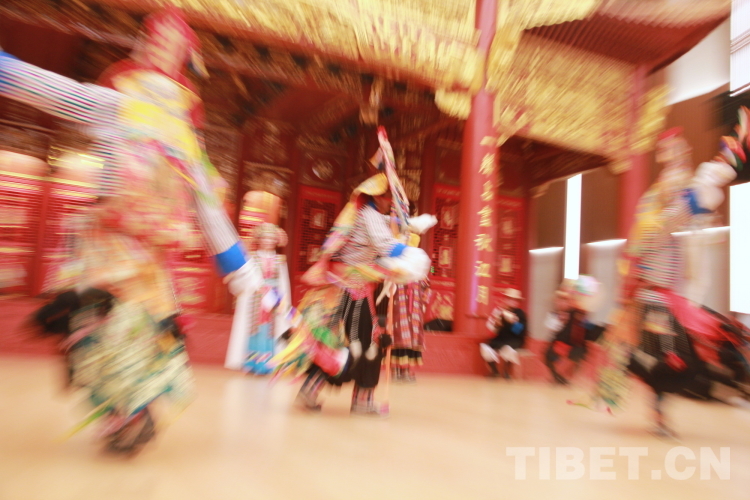 拉萨市城关区娘热民间艺术团在藏戏这一非物质文化遗产瑰宝的传承中硕果累累,拥有西藏自治区级、拉萨市级和拉萨市城关区级多位非遗传承人,是西藏自治区100多个民间剧团中唯一一个能够完整表演“八大藏戏”的团体。图为拉萨市城关区娘热民间艺术团表演的藏戏开场《温巴顿》片段 摄影:刘莉