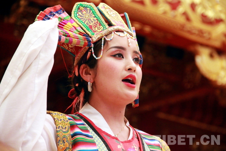 图为拉萨市城关区娘热民间艺术团演员洛桑卓玛表演藏戏开场《温巴顿》片段 摄影:刘莉