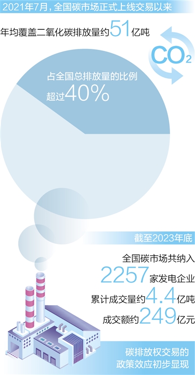 2021年7月全国碳市场正式上线交易以来,运行整体平稳,年均覆盖二氧化碳排放量约51亿吨,占全国总排放量的比例超过40%。截至2023年底,全国碳市场共纳入2257家发电企业,累计成交量约4.4亿吨,成交额约249亿元,碳排放权交易的政策效应初步显现。