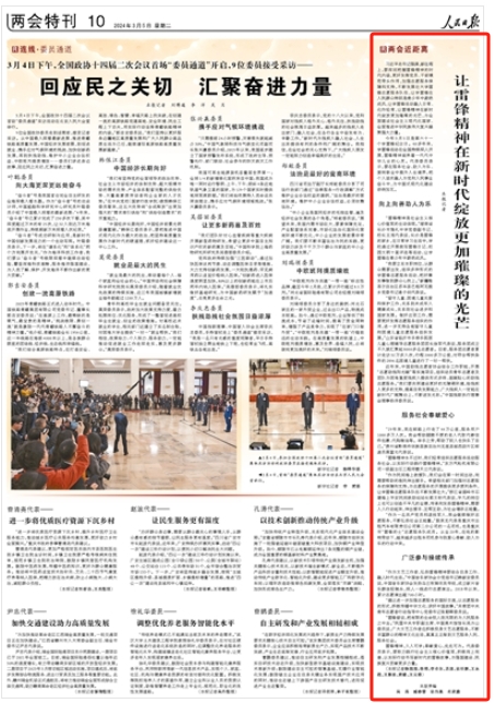 雷锋精神,人人可学;奉献爱心,处处可为。代表委员表示,要努力践行社会主义核心价值观,积极向上向善,以实际行动书写新时代的雷锋故事,为强国建设、民族复兴贡献更多力量。(本报记者陈圆圆、徐阳、李卓尔、苏滨、张明瑟、王永战、王影迪、窦皓、王云娜)