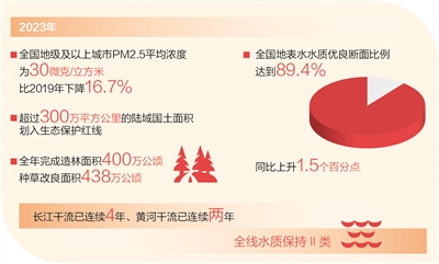 2023年,全国地级及以上城市PM2.5平均浓度为30微克/立方米,比2019年下降16.7%;全国地表水水质优良断面比例达到89.4%,同比上升1.5个百分点;超过300万平方公里的陆域国土面积划入生态保护红线。