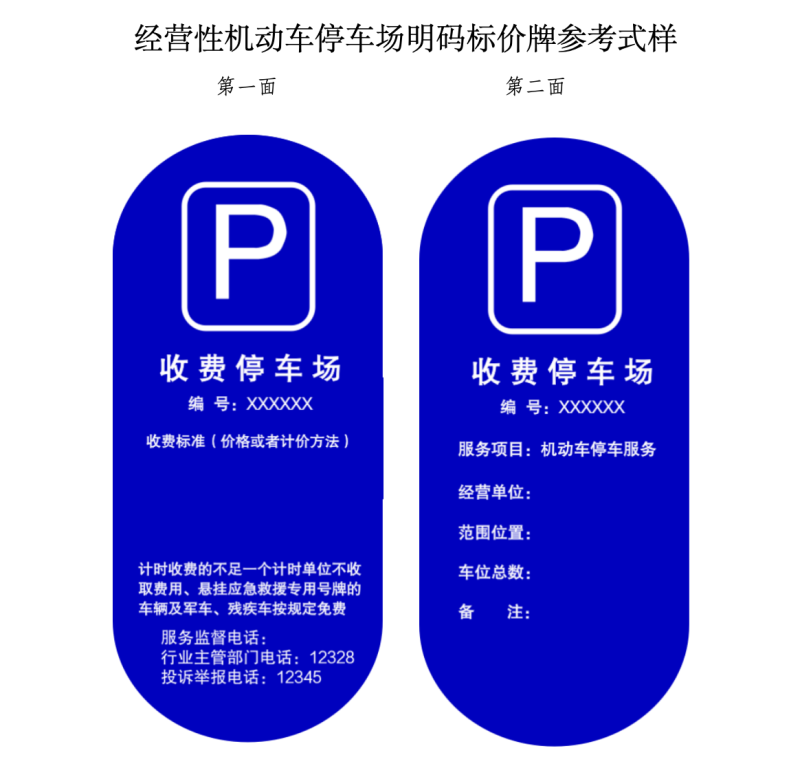 根据相关法规政策的新要求,按照依法合规、便民利民、不做大改的原则,征求意见稿对两种机动车停车场明码标价牌参考式样进行了修改完善,并附上“经营性机动车停车场明码标价牌参考式样”和“道路电子收费停车场明码标价牌参考式样”,供相关单位参照自行制作明码标价牌,明码标价牌编号为北京市公共停车场经营备案证的备案号。