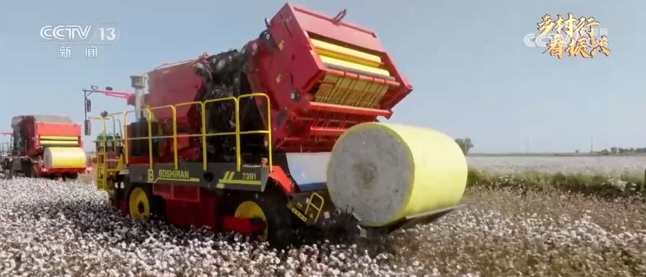 这几年,新疆绝大部分地区都已经实现了机械化采棉。棉花采收打包一体机,除了自动采棉之外,还有打包的功能,当地人给它取了个特别形象的名字叫“下蛋机”。当装棉花的车厢装满后,它的尾部会自动吐出一个大棉包,这个棉包用金黄色包装膜包裹着,从空中俯瞰像是一枚巨大的“金蛋”,既干净又方便后续运输。这些“下蛋机”是这两年最新上市的我国自主研发、自主生产的机器。