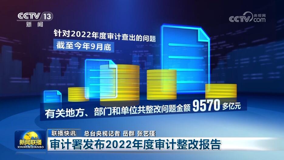 12月26日,审计署发布2022年度审计整改报告,报告显示,针对2022年度审计查出的问题,截至今年9月底,有关地方、部门和单位共整改问题金额9570多亿元,制定完善规章制度1600多项,追责问责2540多人,解决了一些不利于改革发展和经济社会稳定的体制机制问题。