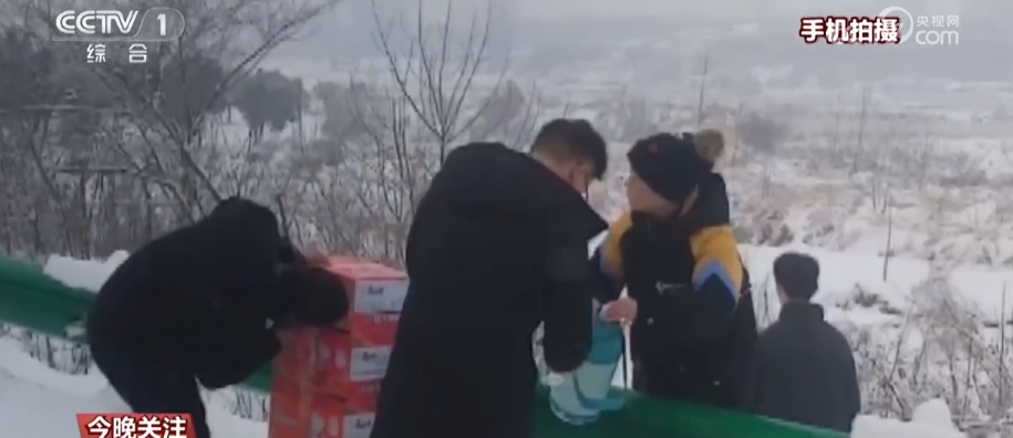邓秀枝在当地经营一家小卖铺,老人烧水,儿子打包方便面,孙辈们也一起帮忙,踏着20厘米厚的积雪,一家人爬上了高速路。