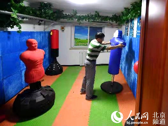 “心释小吧”陈设有仿真人和沙袋等供居民释放压力。人民网孟竹 摄