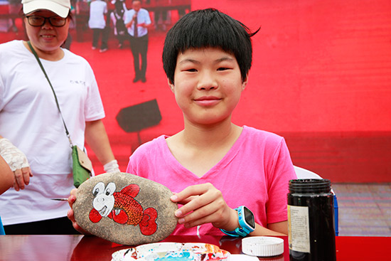 一位小学生介绍她的石画作品:“我画的是一条鱼,这是我们密云水库的特色,欢迎大家都到我的家乡来,尝一尝味道鲜美的水库鱼。”于莲梅摄