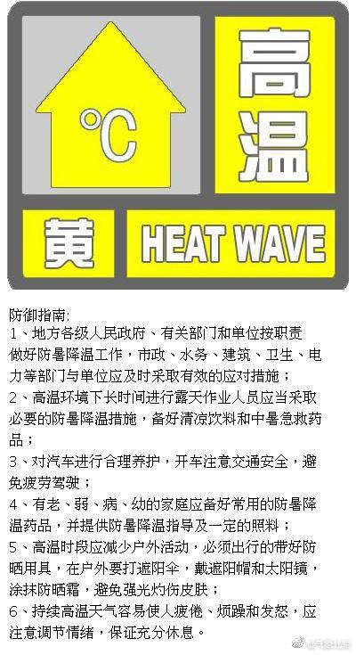 人民网北京7月24日电 据北京市气象局官方微博@气象北京消息,北京市气象台2019年7月24日17时00分升级发布高温黄色预警信号:预计25日至27日,北京市大部分地区日最高气温将连续三天在35℃以上,请注意防范。