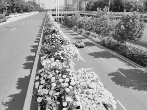 昨日(7月24日)上午,在体育大街裕华路桥区,记者看到在桥体两侧悬挂着两排花箱,花箱内种植着粉色的垂吊牵牛、黄色的百日草、红色的串红……尽管烈日炎炎,但花朵格外鲜艳夺目,令人心旷神怡。同时,在槐安路高架桥上,五颜六色的鲜花盛开在桥体两侧,如同一条空中花廊,让人在这个夏日有了些许清爽。