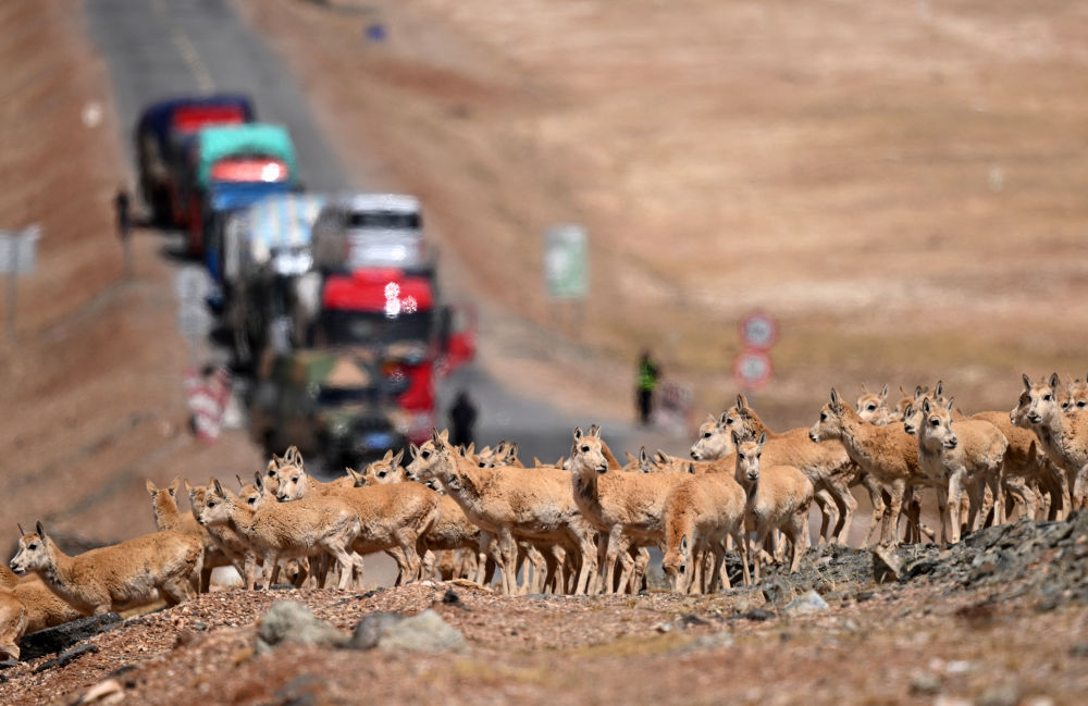 5月27日,藏羚羊在可可西里五道梁地区通过青藏公路。新华社记者 张龙 摄