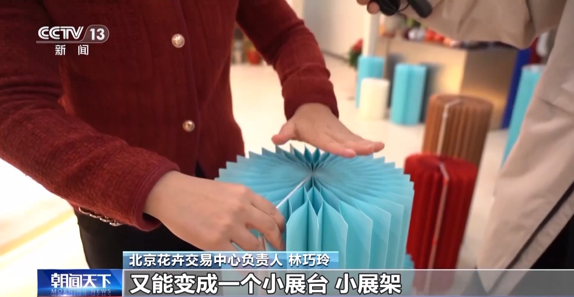 北京花卉交易中心负责人 林巧玲:很轻便,都是纸做的,然后一拉开,又能变成一个小展台、小展架。十公斤、二十公斤的组合盆栽摆在上面都没有问题。