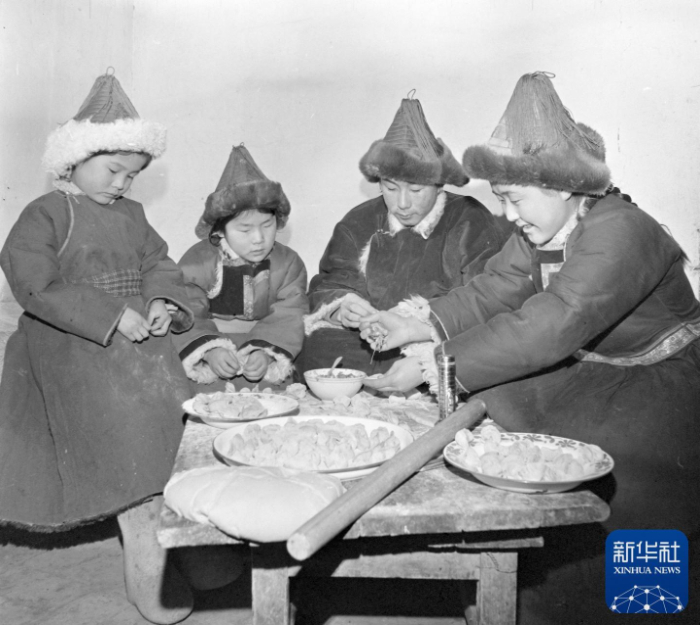 1981年,内蒙古呼伦贝尔牧民正在高高兴兴包饺子过春节。新华社记者 白斯古郎 摄