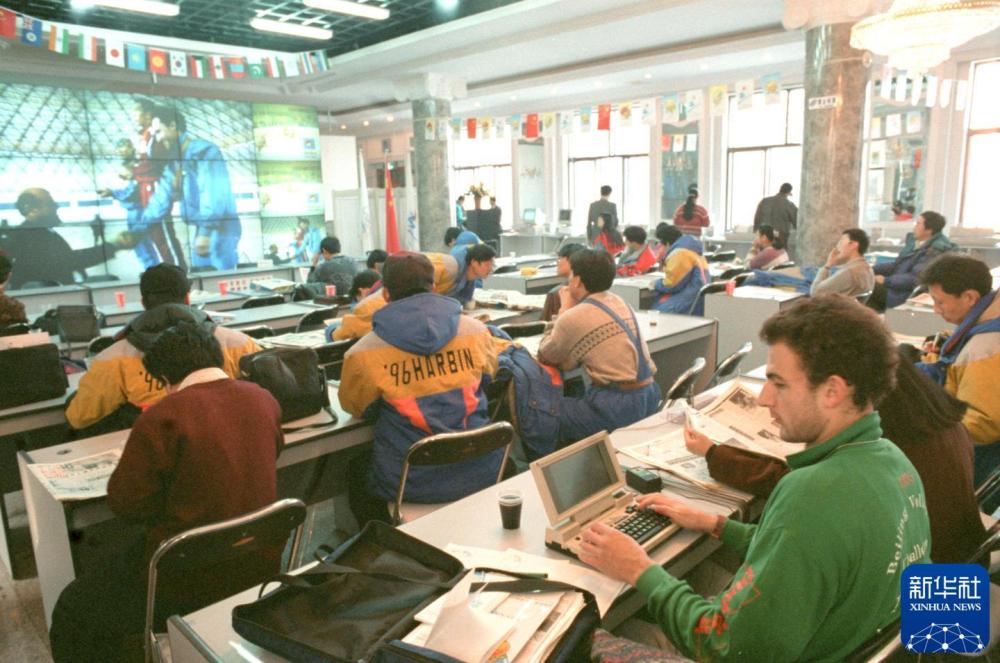 第三届亚冬会新闻中心记者工作间里设有大屏幕和信息库,中外记者每天从这里获取大量赛场信息,发往世界各地。新华社记者 周确 摄
