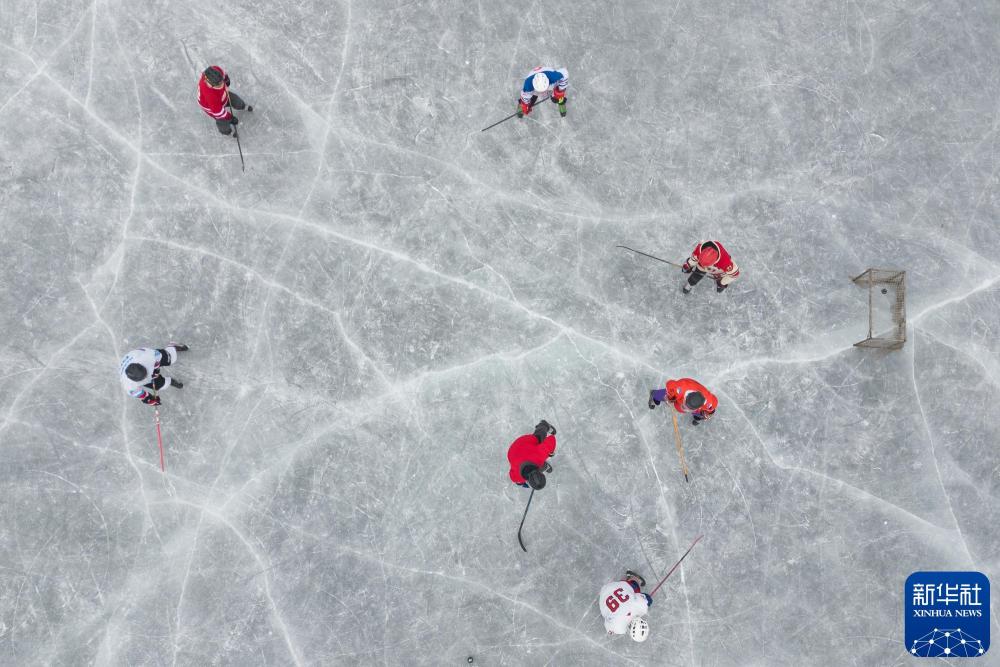 2025年1月7日,冰球爱好者在哈尔滨丁香公园的冰面上打冰球。新华社记者 张涛 摄
