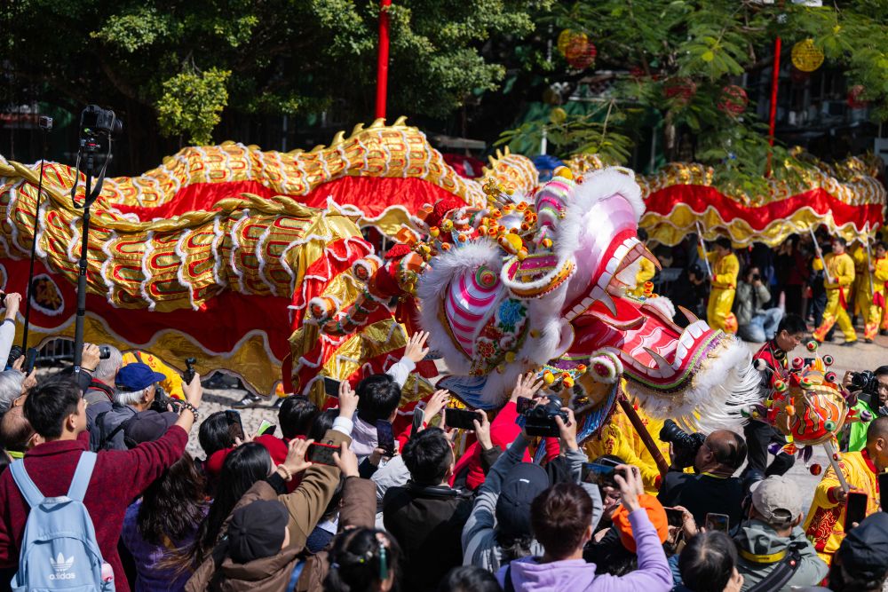 摸摸闪亮的“金龙”鳞片,领上金光灿灿的“元宝”,和财神爷一起比手势自拍……大年初一的上午,澳门传统地标大三巴再度成为欢乐的海洋,传统节目金龙醒狮雄赳赳巡城,所到之处欢腾一片。