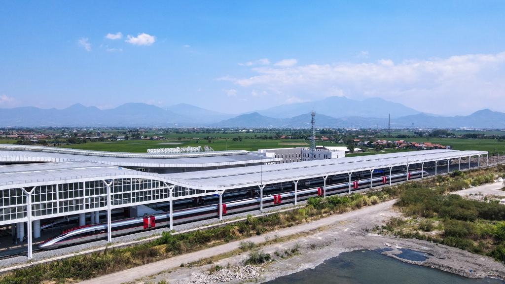 图为2024年9月13日在印度尼西亚万隆德卡鲁尔站拍摄的停靠在站台上的雅万高铁高速动车组(无人机照片)。新华社记者徐钦摄