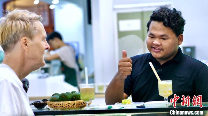 泰国留学生杨富贵和英国旅游博主史蒂夫品尝牛油果饮品。陈晨 摄