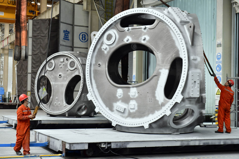 在位于山东省滨州市惠民县的山东国创精密机械有限公司,工作人员在对风电轮毂进行喷涂作业。新华社记者郭绪雷 摄