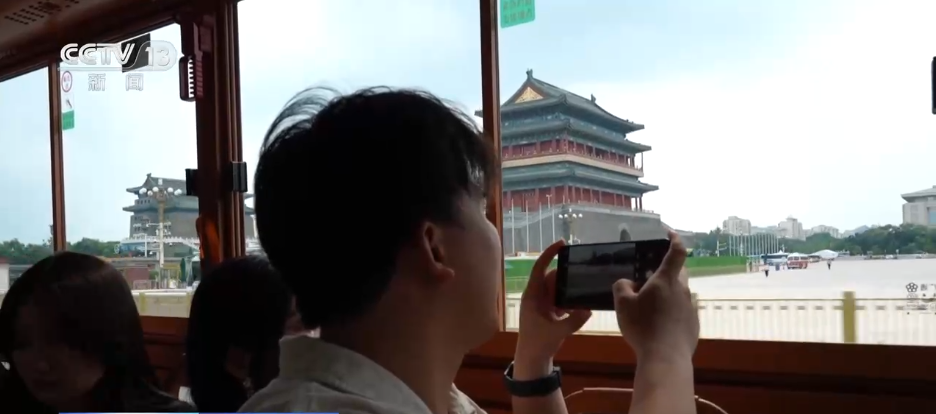在北京前门地区,记者身后可以说是暑期最热的公交线路之一——大美中轴观光线,它车身仿古,参照了百年前北京的第一辆有轨电车,当师傅踩下制动板,连接的铜铃铛就会铛铛地响个不停,提醒行人躲避,因此它也得名铛铛车。