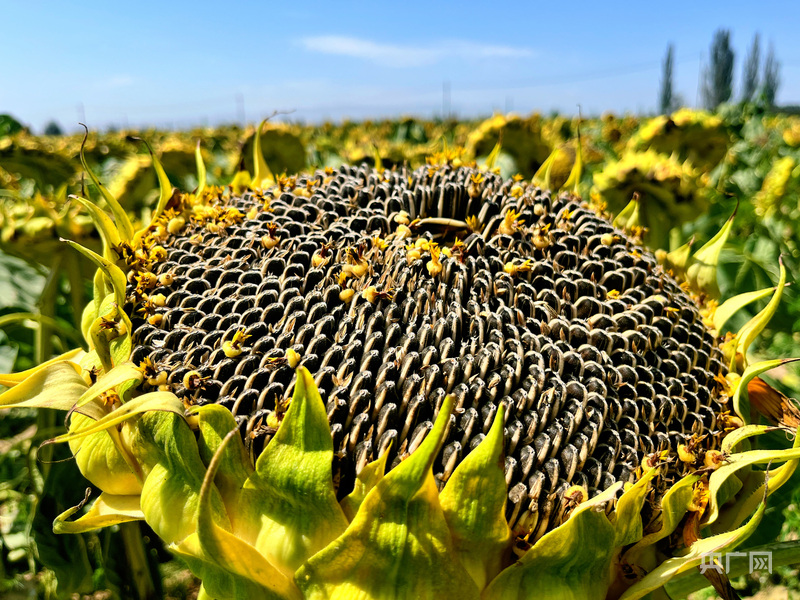 在这片万亩连片种植区,种植户王多宝正带领工人切割葵盘、插杆晾晒。“今年天气好,葵花长势特别旺,籽粒又大又亮,产量肯定差不了。”尽管汗水浸湿衣衫,喜悦却洋溢在他的脸庞。